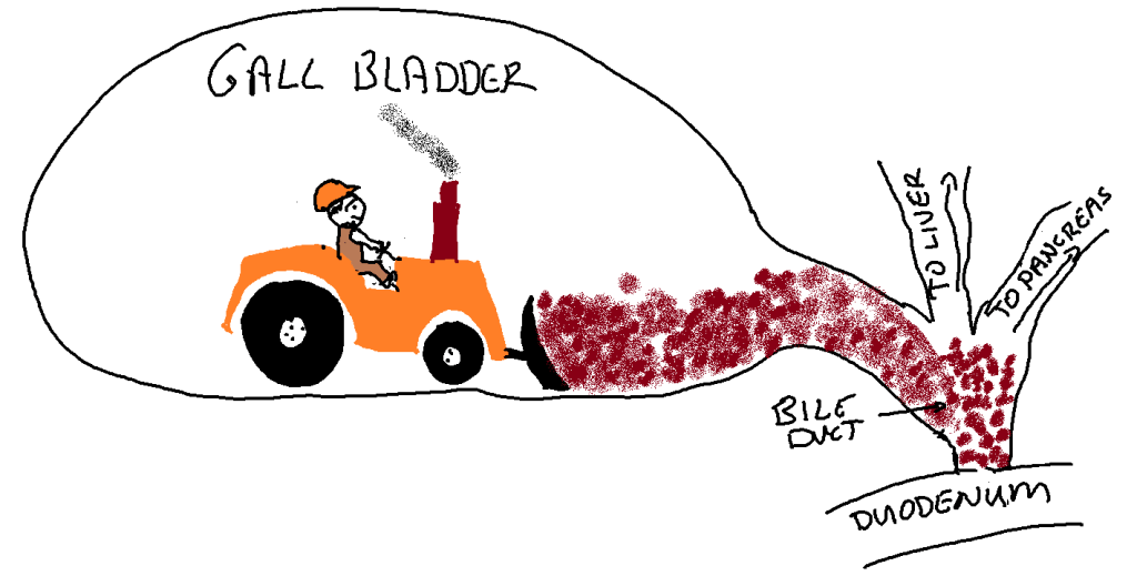 Now I’m regretting declining a copy of the ultrasound of my gall bladder and it’s warehouse of stones emailed to me. So, instead here’s my rendition based on what it felt like.