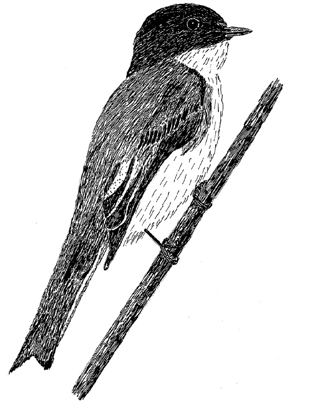 The air is cool this morning. The screened porch faces the lake on the northern side of the cabin and is ten feet above the ground, and the lake surface is at least thirty feet lower down the hillside, giving me a false sense of elevation. I put on a second layer and set my book down periodically to warm my hands around my coffee mug. The sun has just risen, but the phoebe is already up and active. “Fee-bee” he calls, announcing his presence. His voice is raspy as if he still has sleep in his throat. His call is similar in duration and rhythm to the chickadee’s two-note “spring-time,” but without the clear tone. Sitting above the brush layer of the forest but below the canopy, I’m at eye level with the phoebe’s preferred habitat. This level above the ground cover and the mammals inhabiting those niches and below the thick canopy of the trees, belongs to the flying creatures.