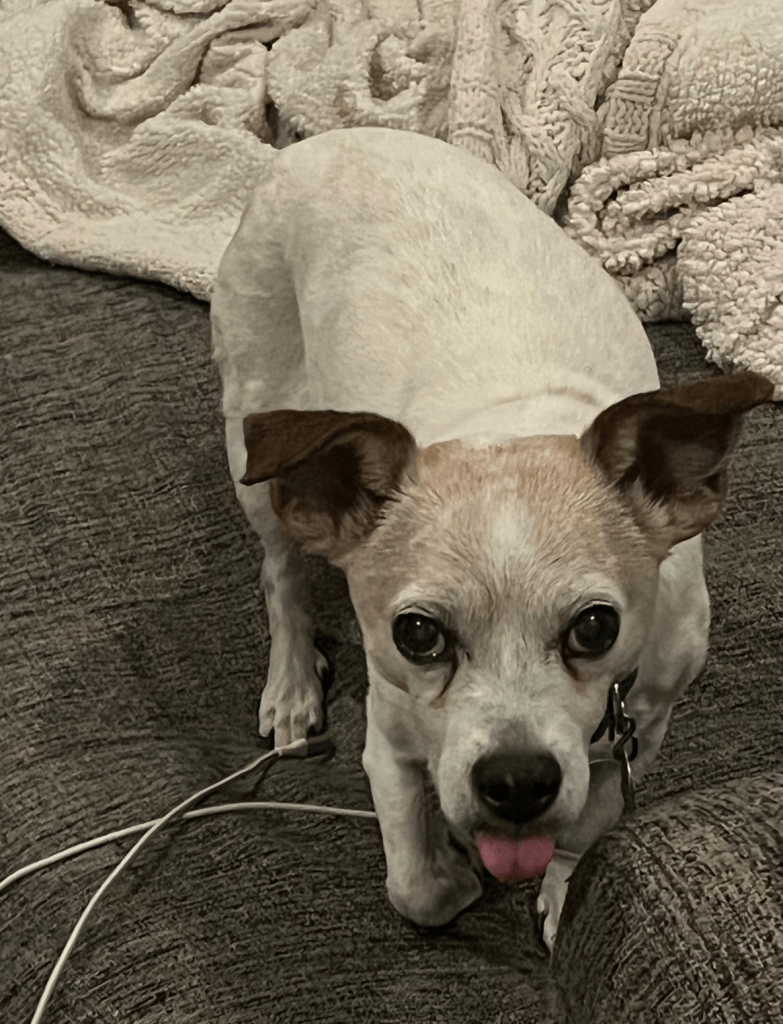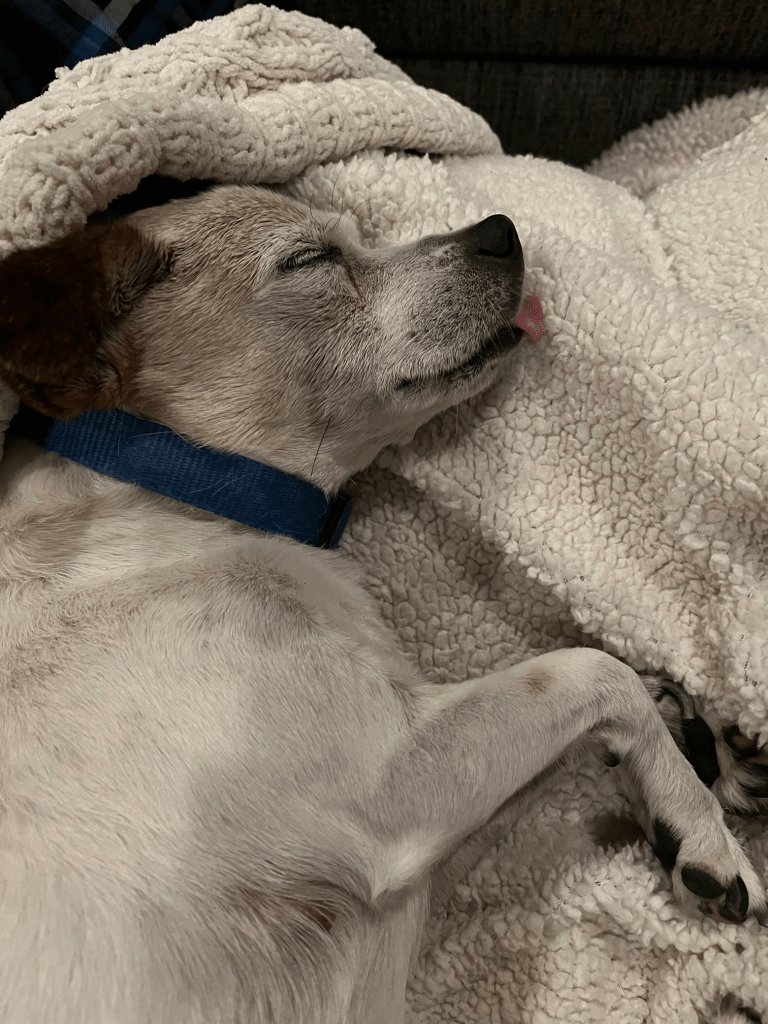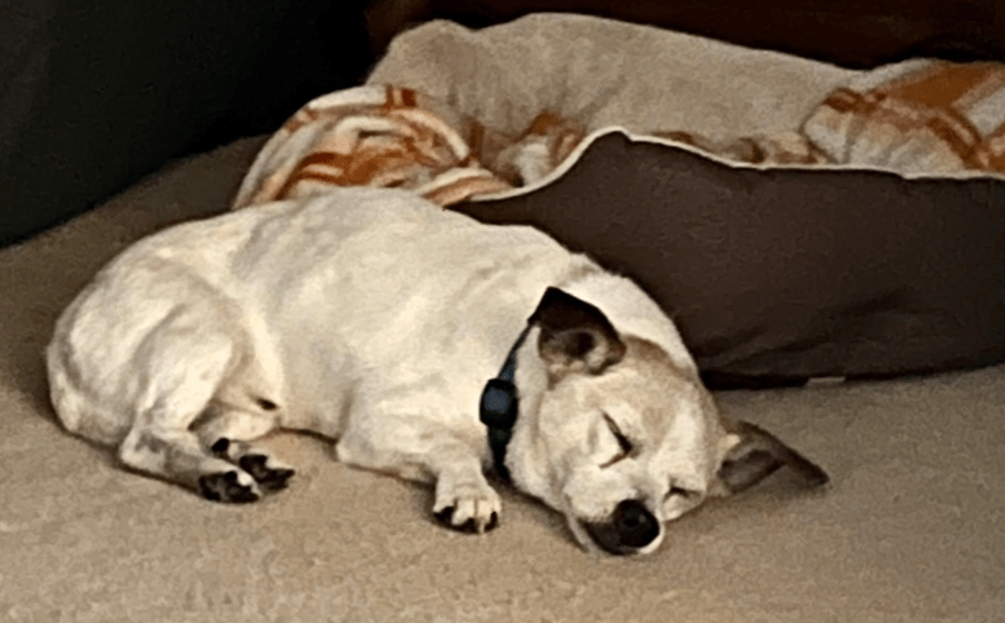 He could be stubborn. See above sleeping in front of his bed instead of in it…just because. He was definitely Tracy and Linnea’s dog. Even though I mostly fed him and did much of the caretaking for him. Let me tell you, he became quite a picky eater. Food he ate happily for a few days got a turned up nose by day five. So, I’d try something new. Nope. Okay, how about this. Nope. Maybe a scrambled egg? Nope. How about some ground beef and rice? Well okay. But only for three days. Then we start again. Despite this, at the end of the evening when he’d finally get his couch time, he’d curl up next to…Tracy. Maybe because I also clipped his toenails as part of the caretaking. He acted like I was cutting off a toe. See above about bravery.