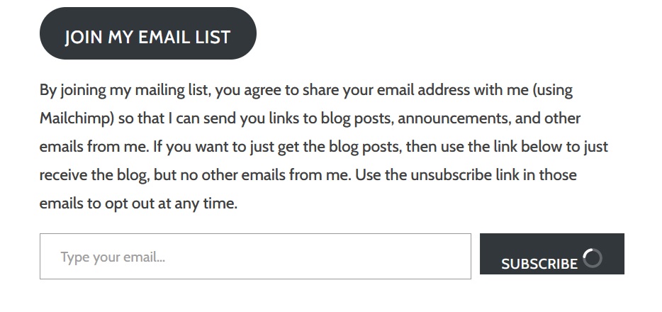 What does this mean if you follow me? If you had previously joined my email list by clicking on the “join my email list” (See screenshot below from this website) you will continue to get emails related to music stuff. That will be the primary function of the email list.
