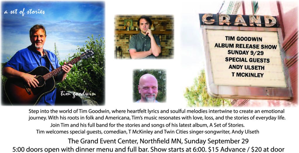 I’m releasing a new album Sunday September 29th. To celebrate this we’re doing an album release show that day at The Grand Event Center in Northfield. The event kicks off with T McKinley doing a short stand-up set. He’ll be followed by my friend Andy Ulseth, a tremendous singer-songwriter from Minneapolis. And then, the band and I will play the full album, beginning around 7:00.